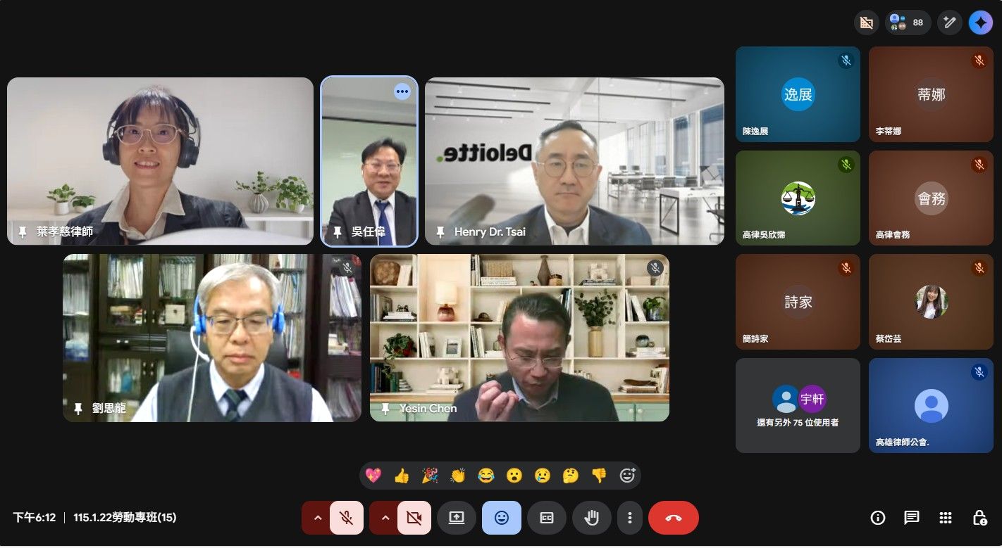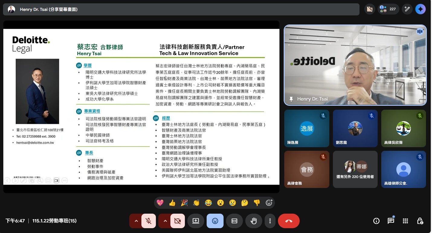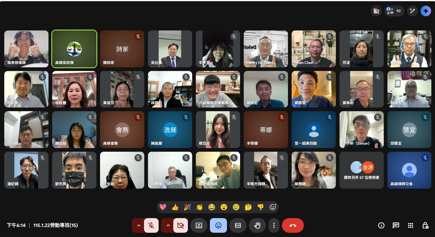 115年1月22日114年度勞動律師專業課程培訓班第15堂視訊課程暨結業典禮